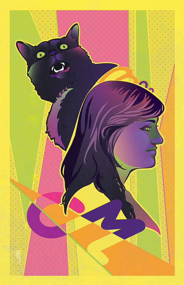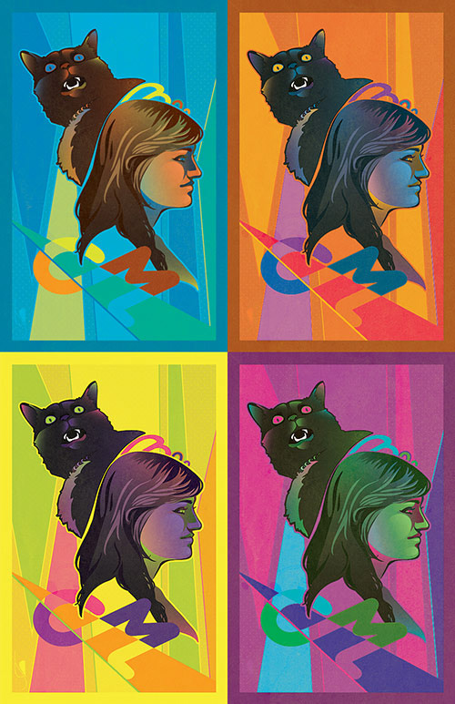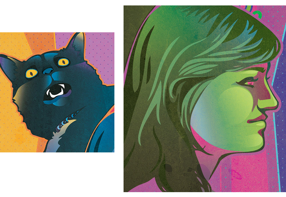 Vector illustrations of my sister and her cat made for her birthday. Shown in four color schemes and created using a combination of Illustrator and Photoshop.